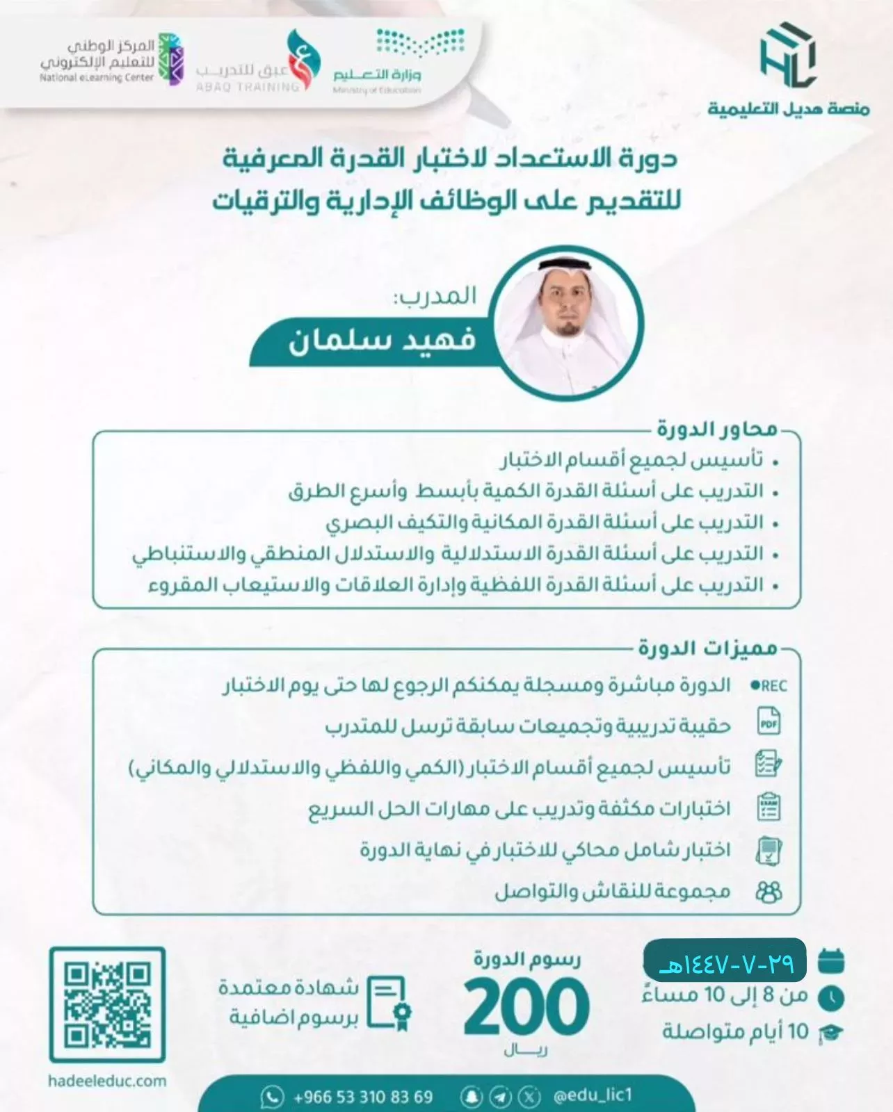 دورة الاستعداد لاختبار القدرة المعرفية للتقديم على الوظائف الإدارية والترقيات (29-7-1447هـ)